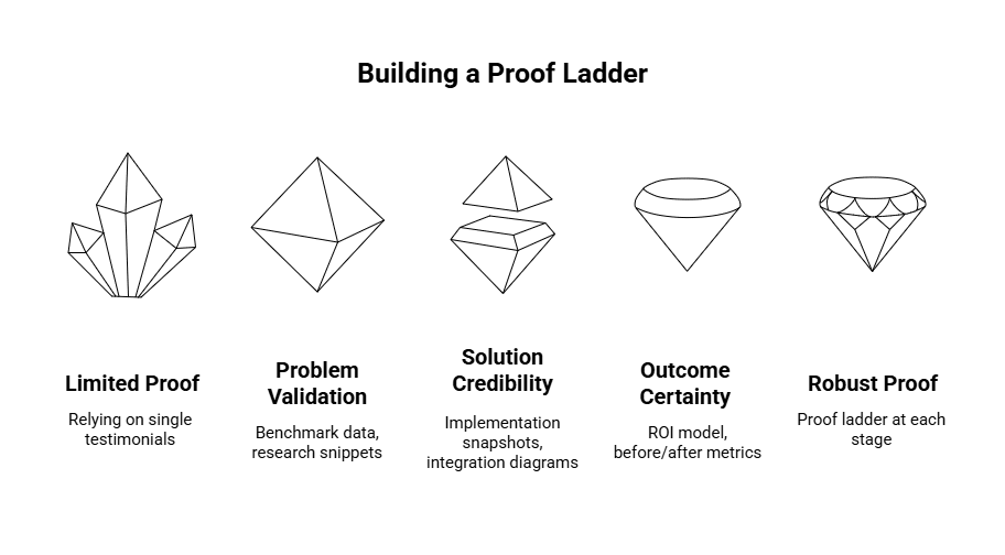 Proof isn’t one thing, it’s a ladder. The mistake I see is relying on a single testimonial or a logo wall. Instead, build a Proof Ladder that maps to the buyer’s job-to-be-done at each stage: